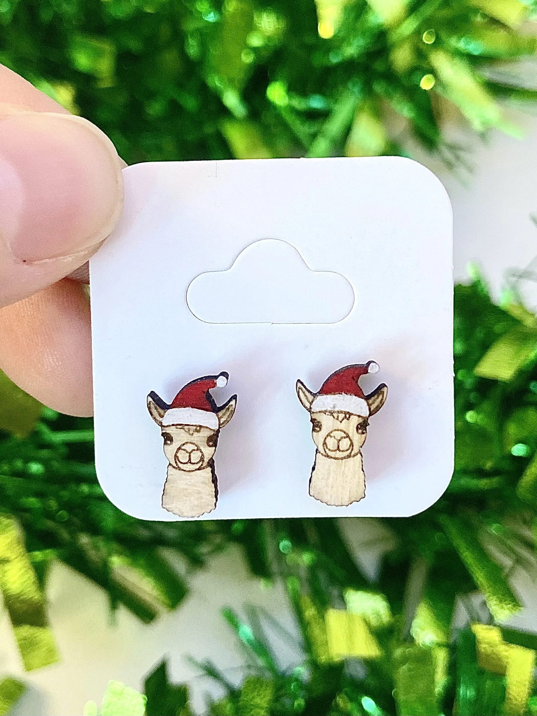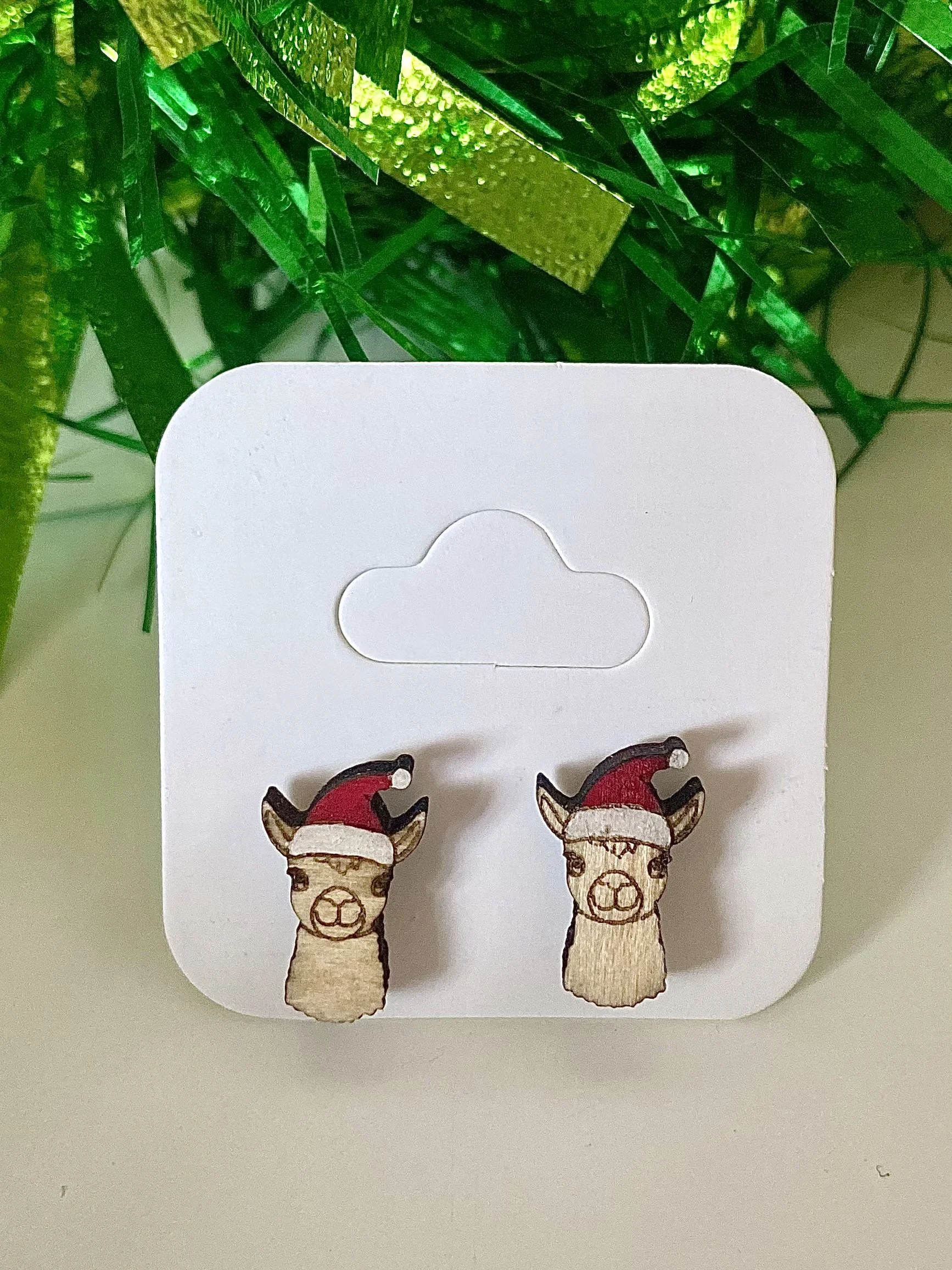 Hand-Painted Wood Smiling Llama Santa Earrings