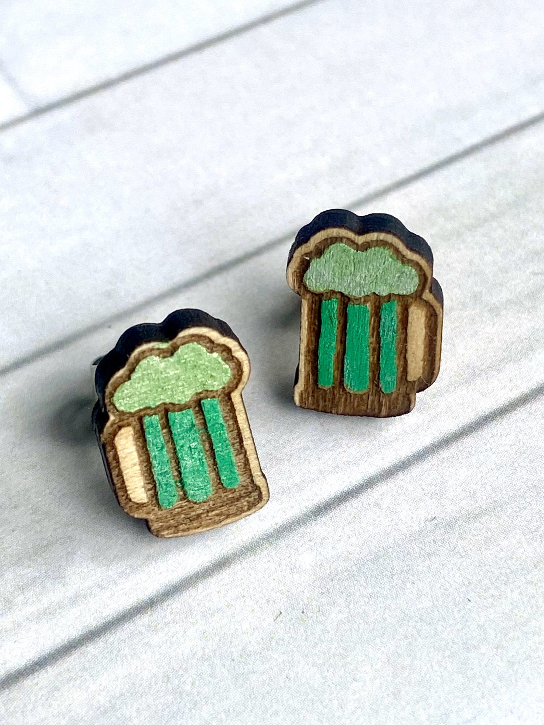 Raise a toast to St. Patrick's Day with these playful green beer stein earrings! Each pair is laser-engraved on natural wood and lovingly hand-painted in rich green tones with charming foam details on top. Fun, festive, and full of personality, theyβre the perfect accessory for parades, parties, and pub nights.